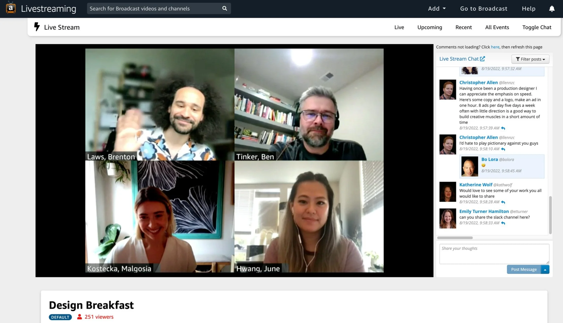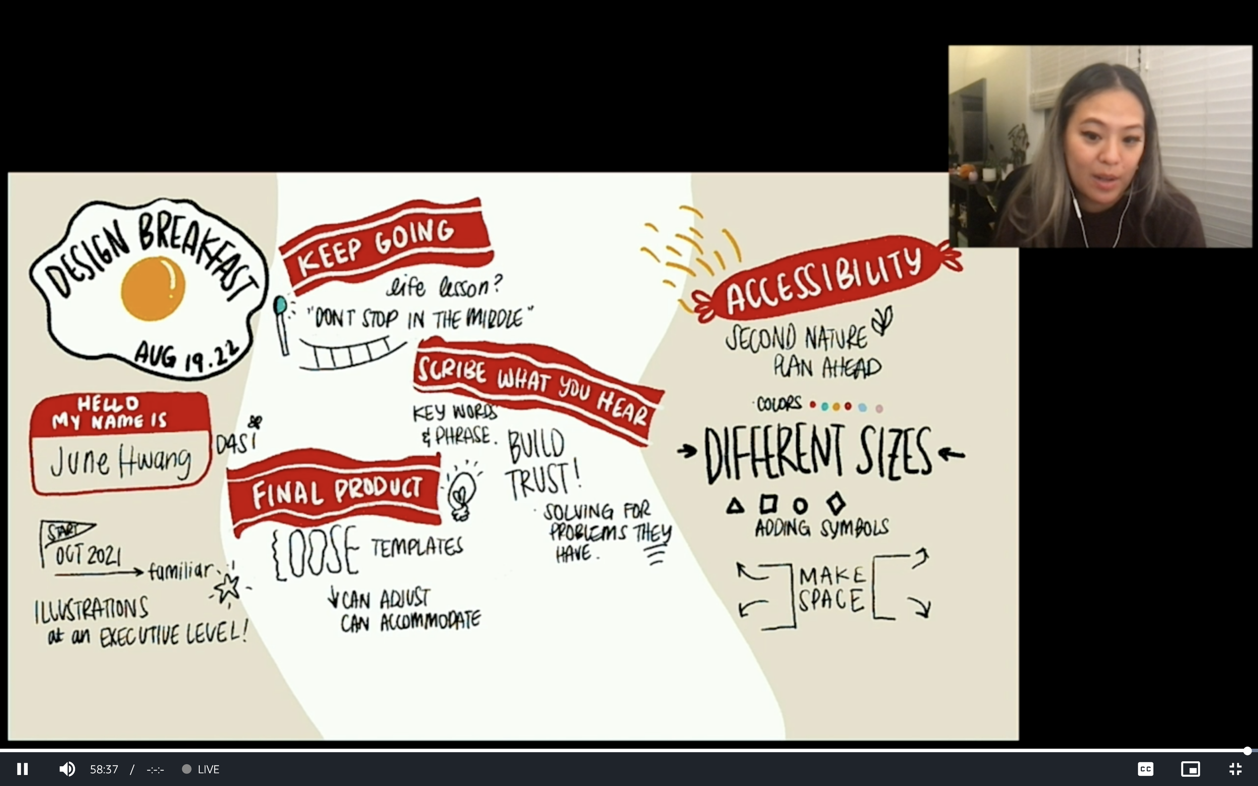 In August 2021, I spoke at Design Breakfast, a bi-monthly talk series presented by the Amazon design community. My session, titled "How Visual Illustration Enhances Design, Planning, and Accessibility," delved into tips I learned from graphic facilitating, emphasizing how these insights can be integrated into everyday design work, and the significance of keeping accessibility top of mind.