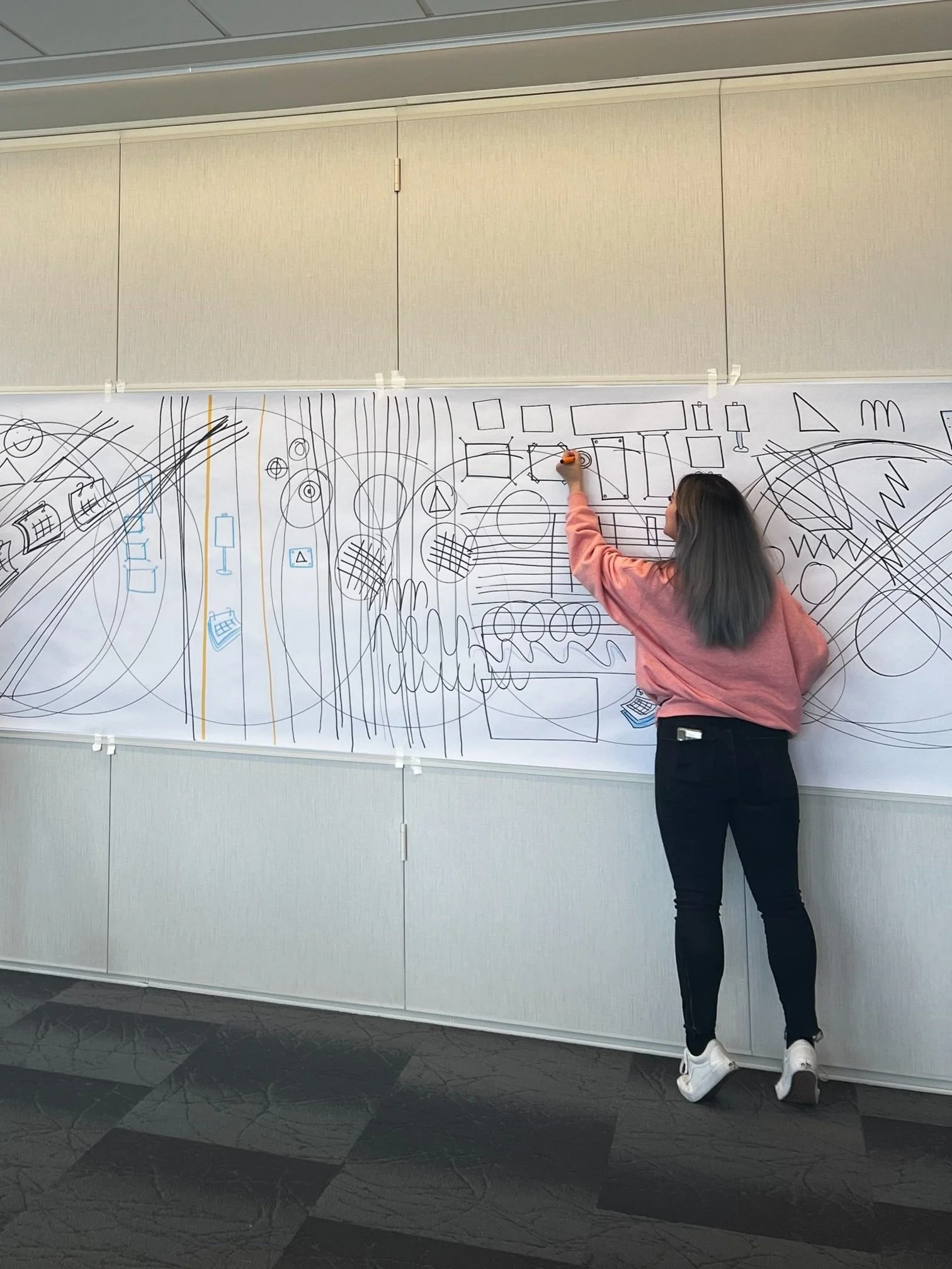 In-person workshops had illustrations physically on the walls. I held workshops for the EV team on best practices for taking photos. D4SI edited the photos to ensure that the illustrations were legible and accessible. I also shadowed many of the “room builds” for each workshop, this consisted of lining the walls with paper, pre-populating drawings and titles of each workshop session around the room. I contributed to implementing a streamlined workflow, reducing the room setup time by two-thirds to one hour.