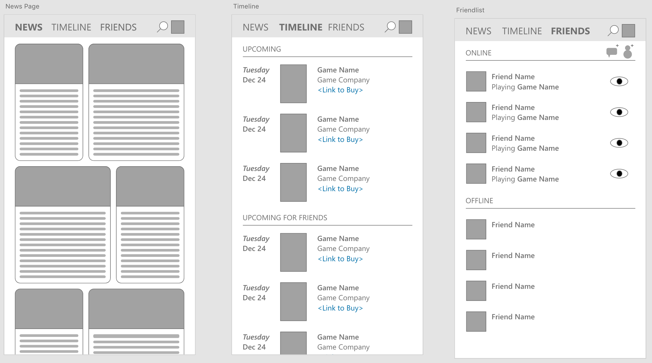 Here are the features I focused on first: Newsfeed, Friends, and Timeline
